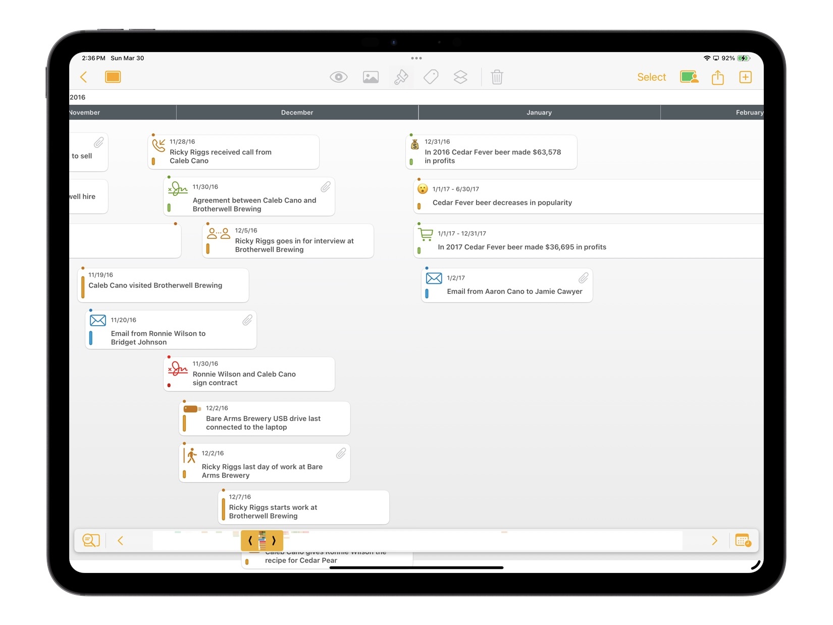 First, there is War Room mode. Connect your iPad to an external monitor (for example, use AirPlay to wirelessly connect to an Apple TV that is connected to a monitor, or you can directly connect an iPad to a monitor). Everyone looking at the screen will see everything that you see on your own iPad screen. For example, if you are discussing a case with your colleagues, it can be useful for you and your team to see the list of events associated with a specific tag—for example, a specific company or a specific issue in the case—and seeing those events in date order may help you with your strategy, such as preparing your theory of the case. Seeing events on a timeline in date order grouped by something like an issue or a person is a great way to explore the relationships between the events in your case.