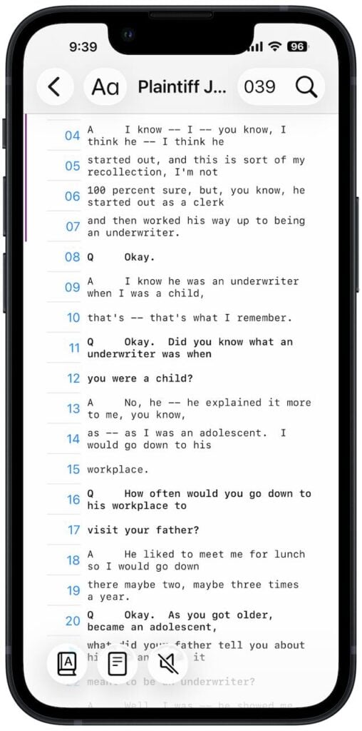 Simply tap a deposition to review it. The app splits each line into two lines so that you can read the transcript even on a small iPhone screen. Line numbers are clearly indicated on the left. The page number is clearly displayed at the top, and you can tap the page number to jump to another page.