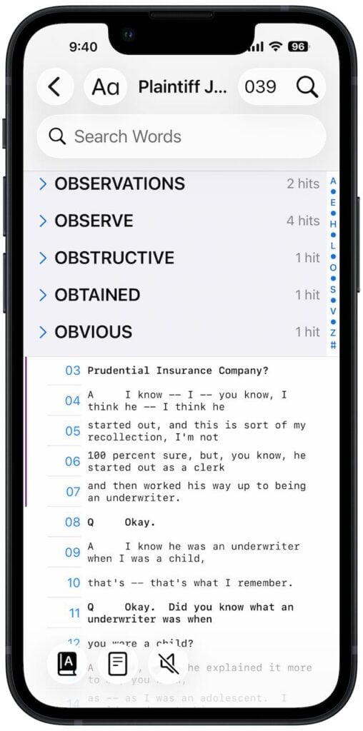 Searching a transcript is easy. You can either use the magnifying glass at the top right to search for words, or you can tap the index button at the bottom left to see each word in the deposition and the number of times it appears.