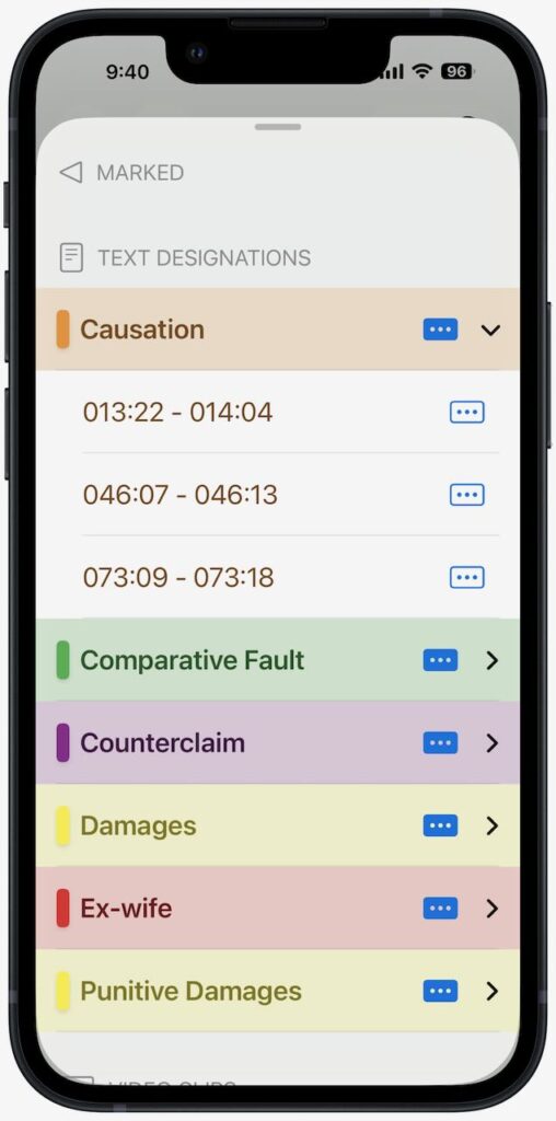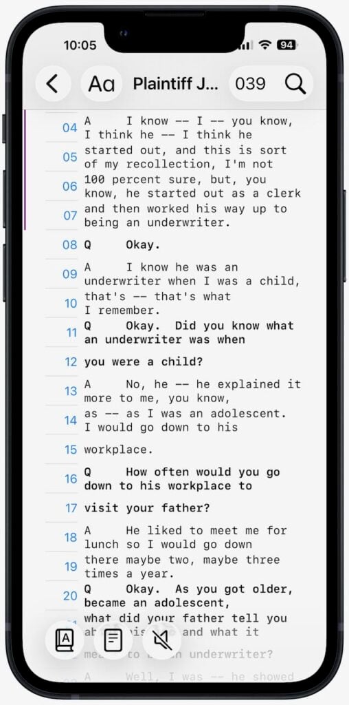 [UPDATE 12/18/25: There is another new feature of the app that I didn’t realize at first, but it is pointed out in the comment to this post by the developer. It is called Marked Lines. If you are listening to a deposition being spoken, or if you are using the hands-free scroll mode, you can simply double-tap on the screen to begin to mark a section, and then you can double-tap again to end the mark mode. The testimony is slightly gray with an arrow on the side to indicate the marked testimony: