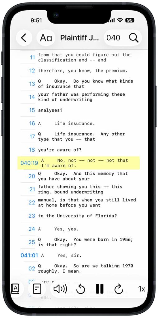 The iPhone app includes another feature that is perfect for the iPhone: the ability to read a deposition out loud. Pick where you want to start—the beginning, or some other part of the deposition—and press the speaker button at the bottom.